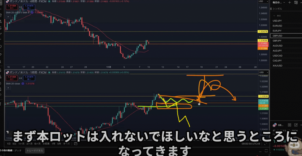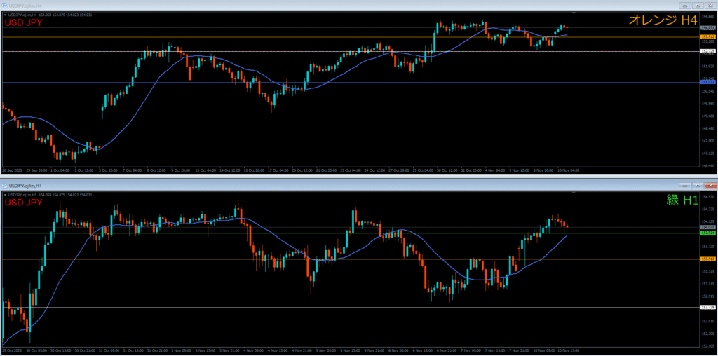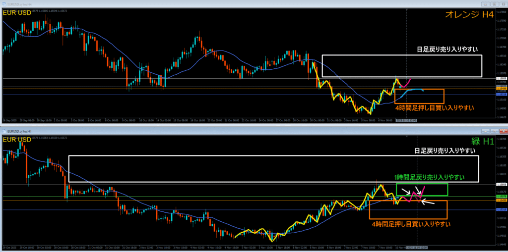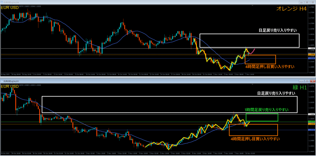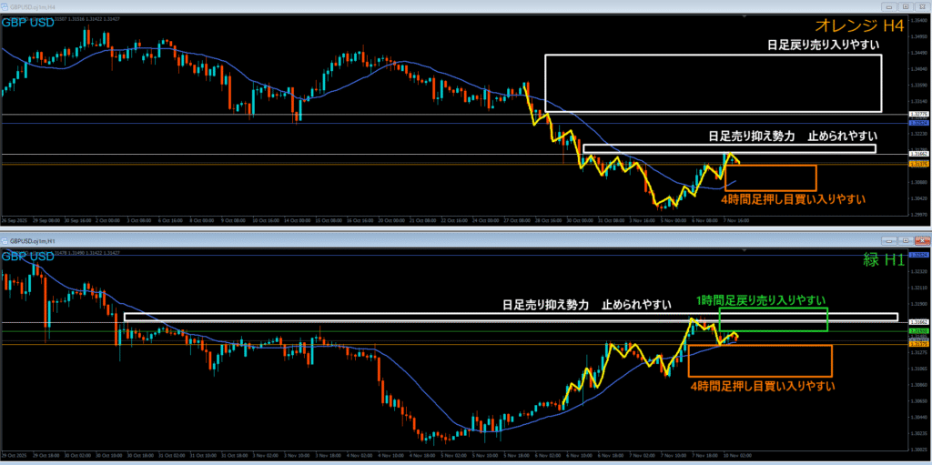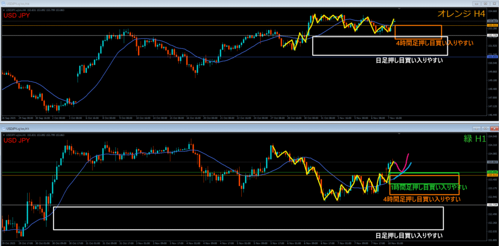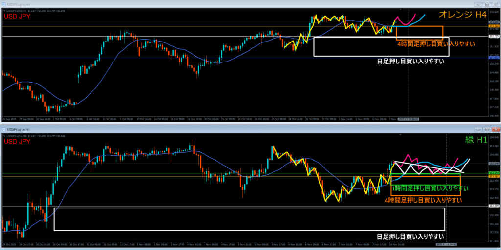 オレンジ色の4時間足サポートラインの下には押し目買い勢力がいる