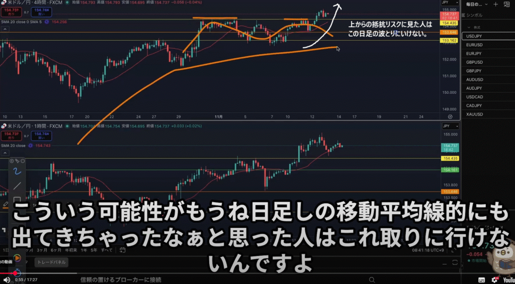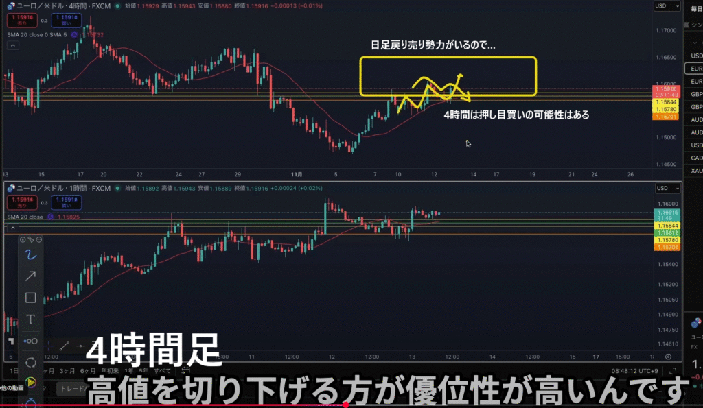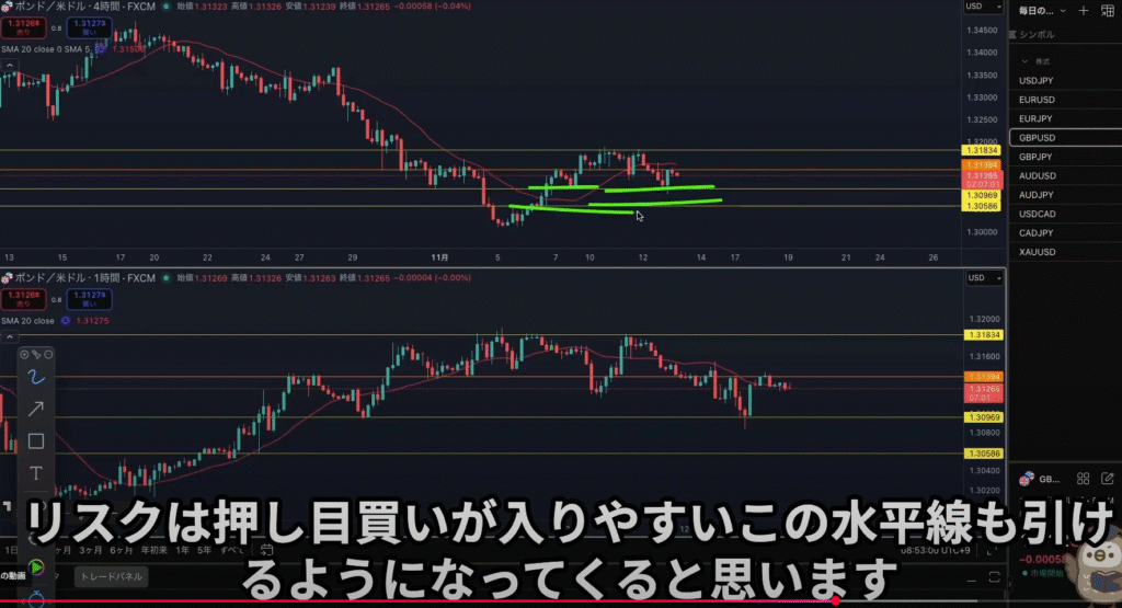 オレンジ色の4時間足サポートラインの下には押し目買い勢力がいる。