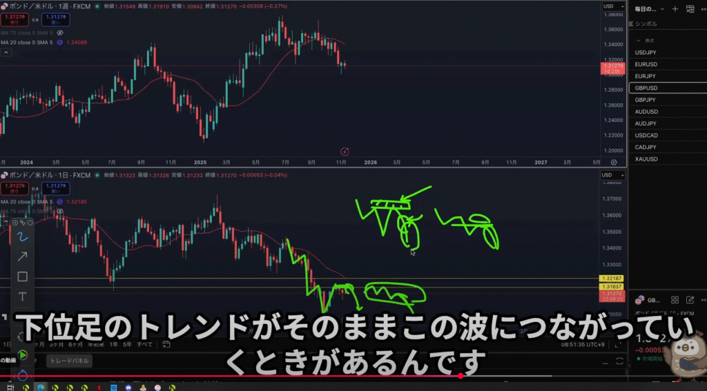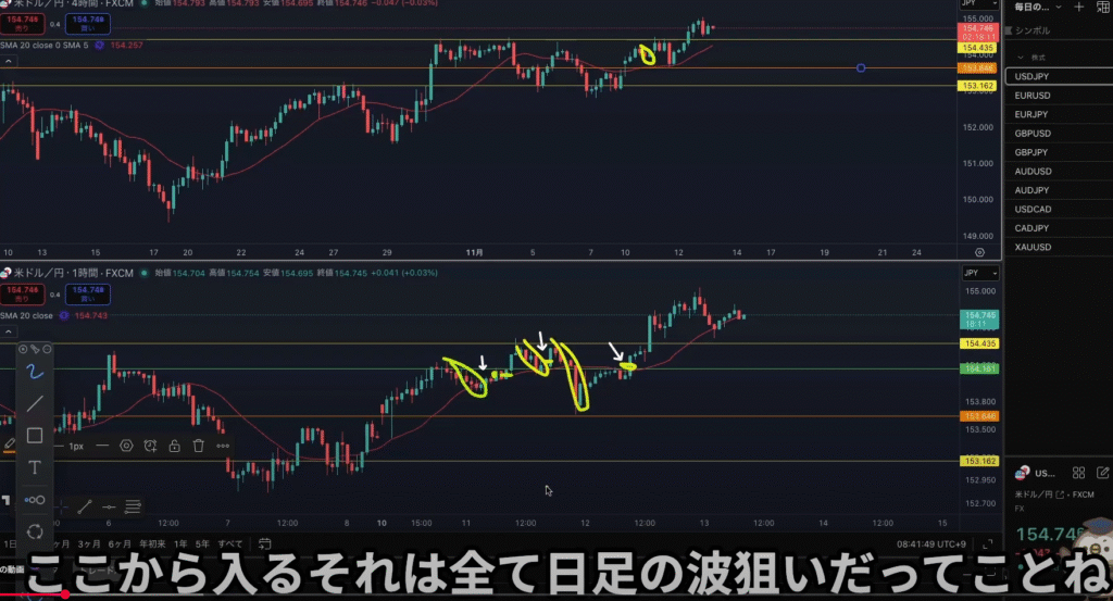 ・ふみさん、ゆたさんのトレードのロジックのほんの1部が分かったと思う…。日足の波を追う。