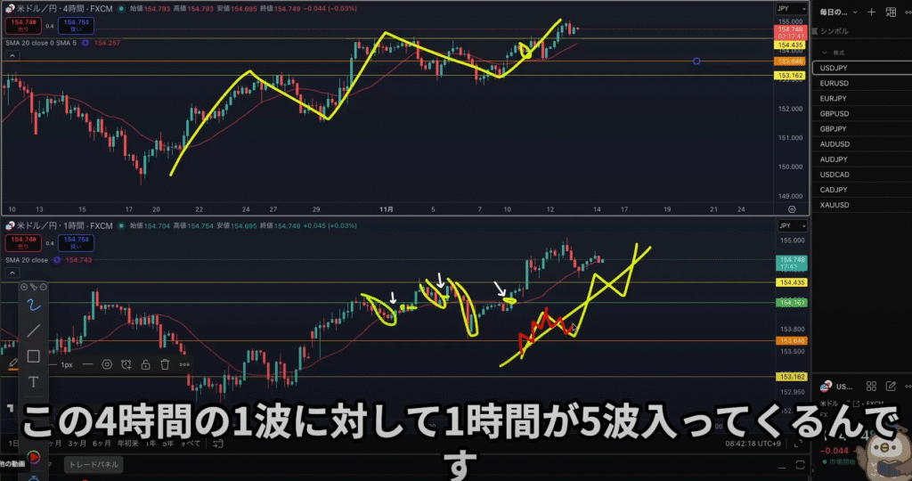 日足は1本ずれると当然1日ずれる、へたしたら週またいで波追わなきゃみたいな感じで難しいところもあると思うので今の自分はエントリせずに観察していく。