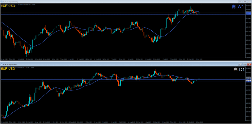 青色の週足サポートラインの下に押し目買い勢力がいる。