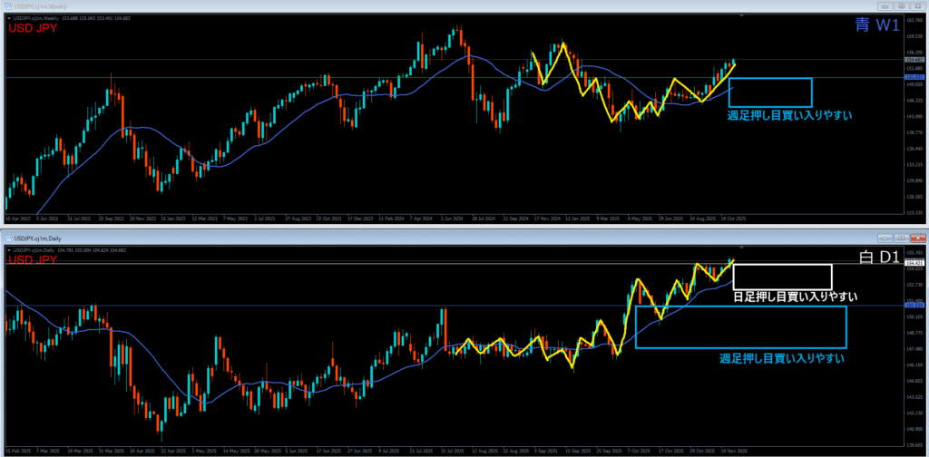 青色の週足サポートラインの下に押し目買い勢力がいる。