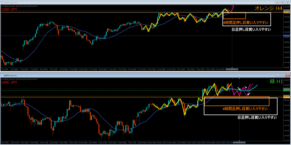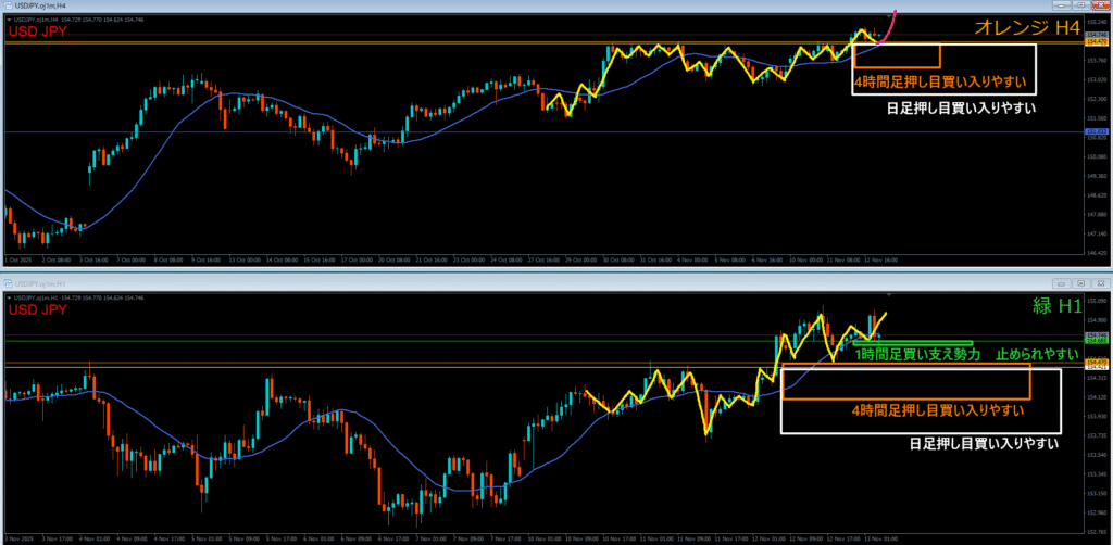 オレンジ色の4時間足サポートラインの下には押し目買い勢力がいる。