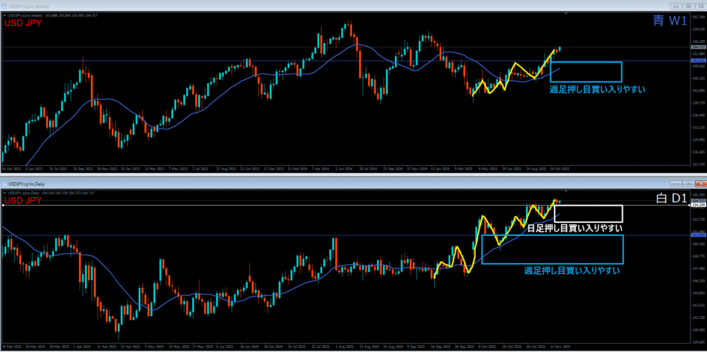 青色の週足サポートラインの下に押し目買い勢力がいる。