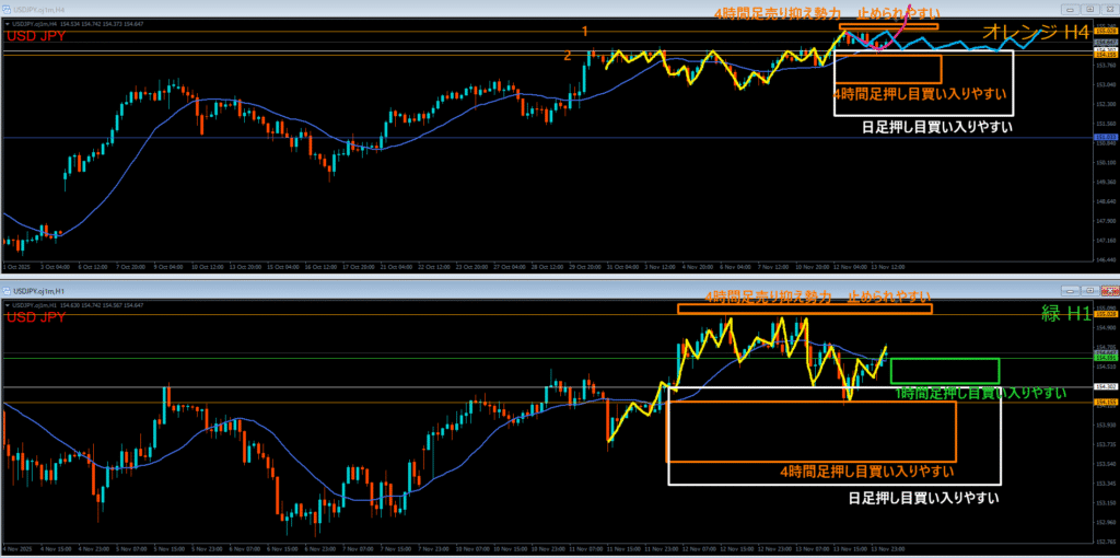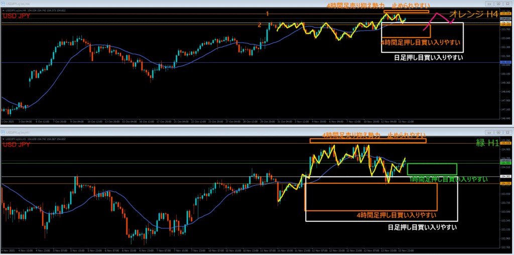オレンジ色の❷4時間足サポートラインの下には押し目買い勢力がいる。