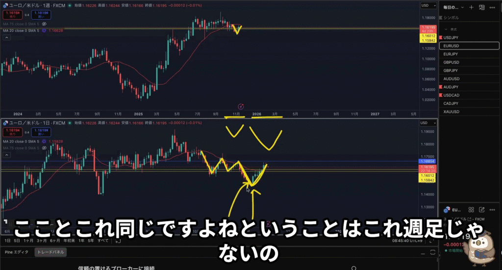 青色の❷週足サポートラインの下には買い支え勢力がいる。