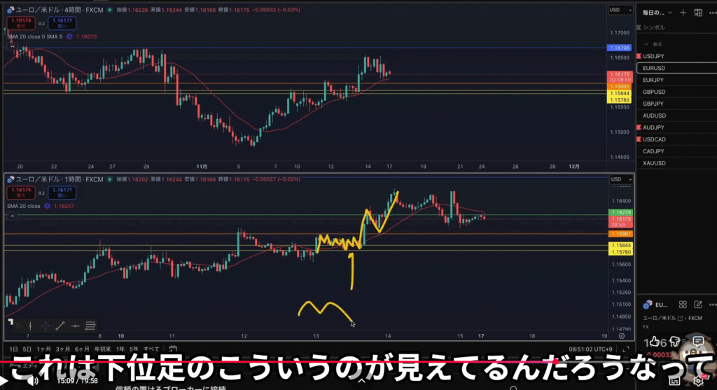 ・4時間足の波のでるところは1時間足の売り抑えがいなくなったところ。