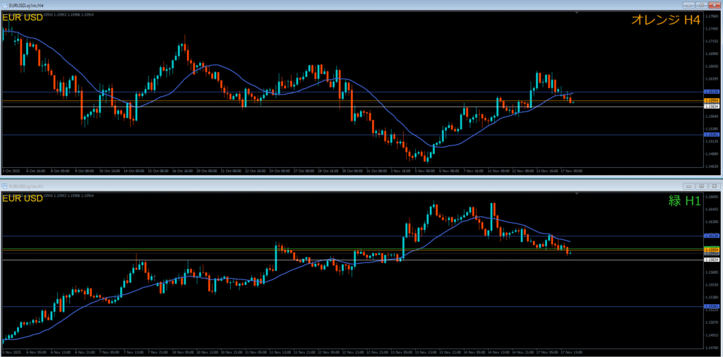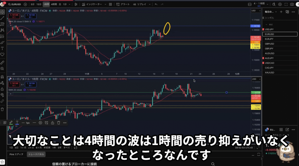 オレンジ色の4時間足レジスタンスラインの上には戻り売り勢力がいる。