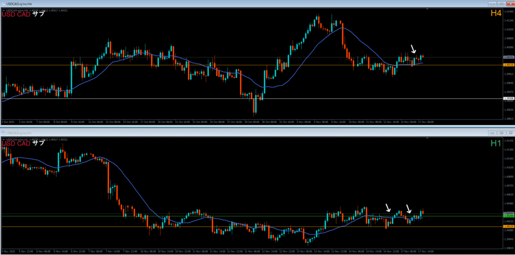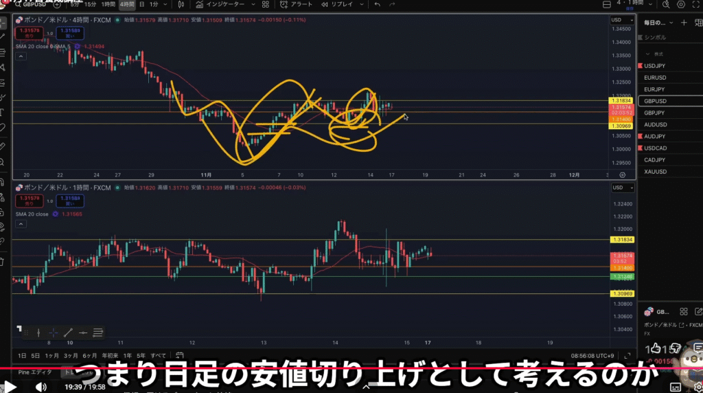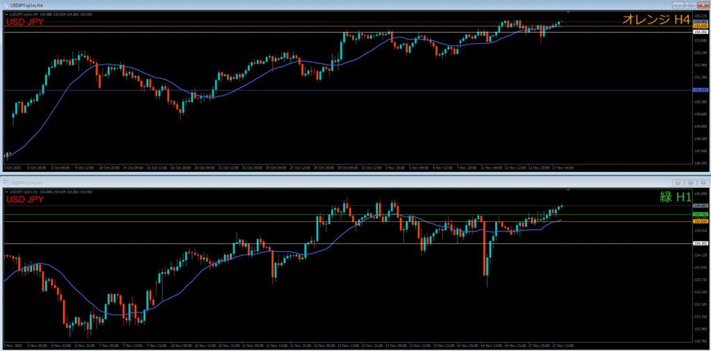 オレンジ色の4時間足サポートラインの下には押し目買い勢力がいる。