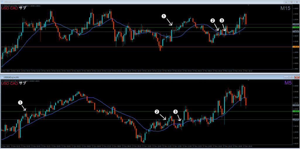 ・1時間足の売り抑えがいないところで15分足に落とすのはエントリをためすのがはやすぎる。ぽじりになってしまう。