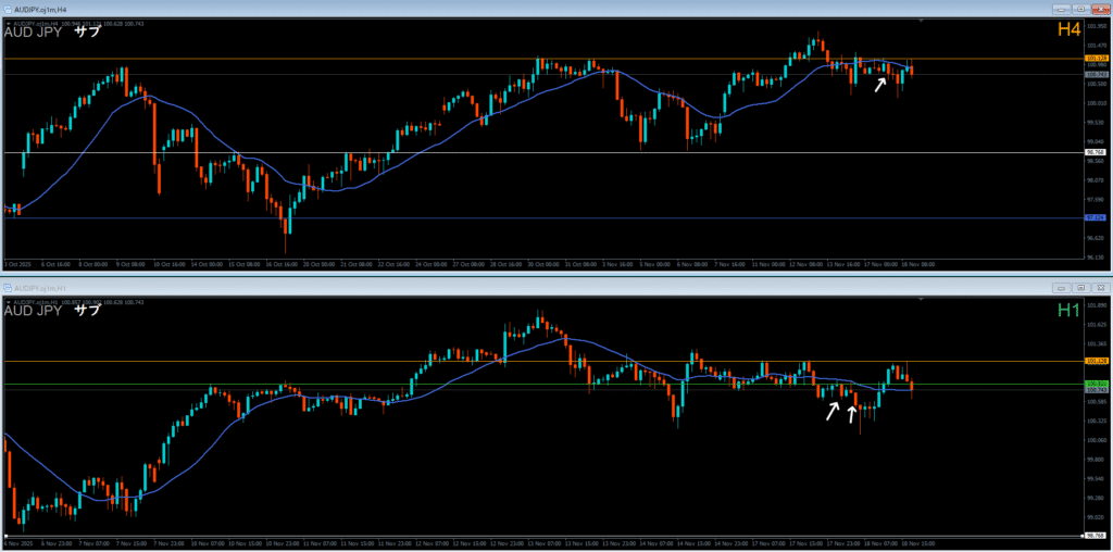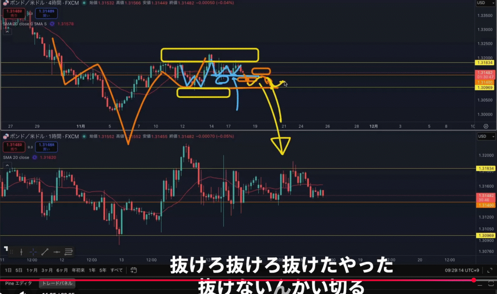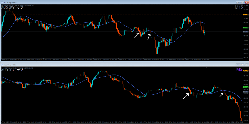 ・1時間の売り抑えが残っている状態で下位足を使うと100%負ける。・1時間が上に切り替わったポイント=波の根っこになりやすい。