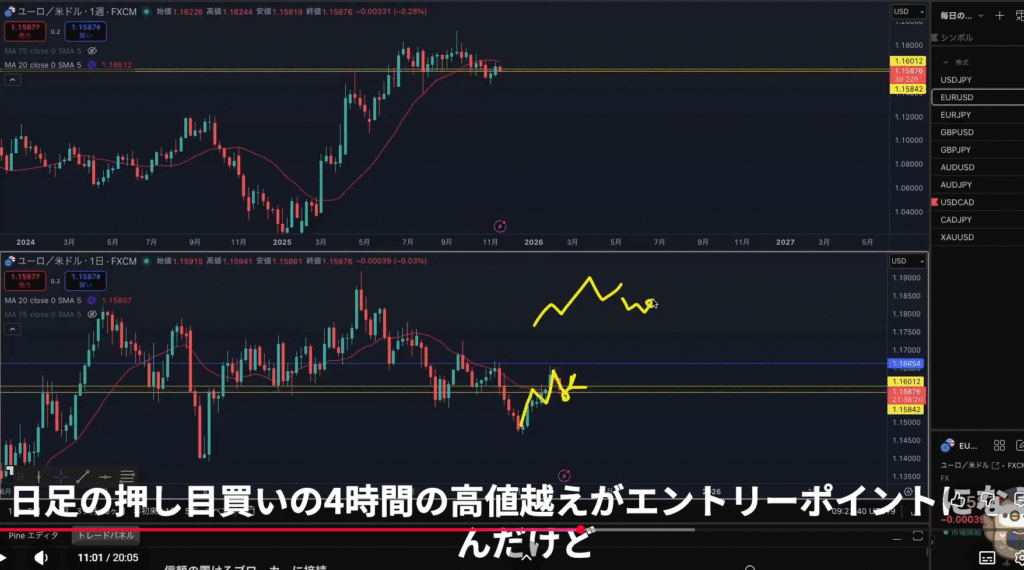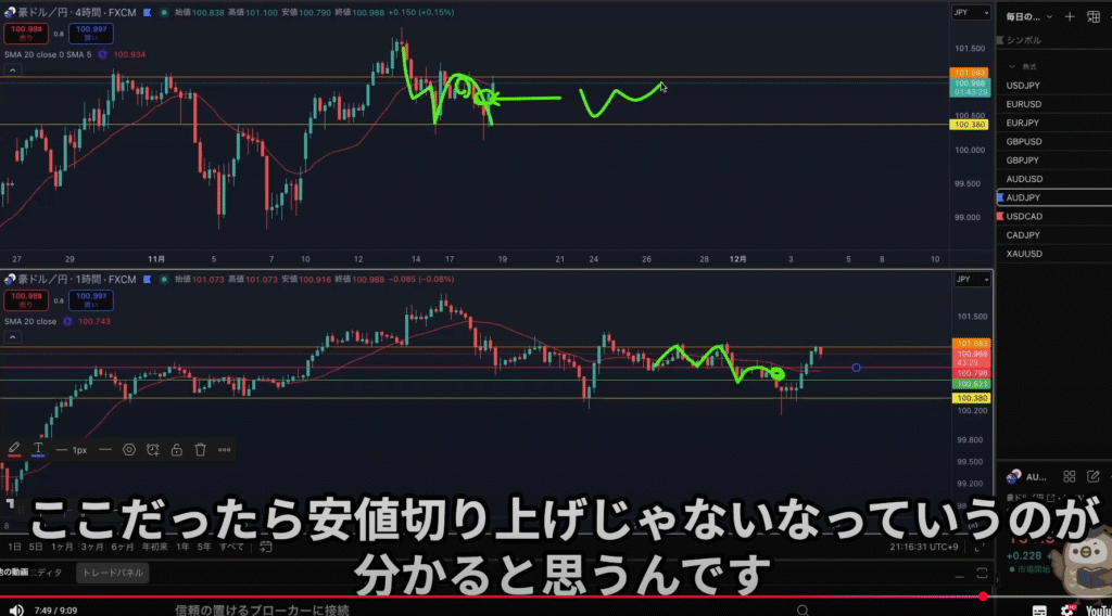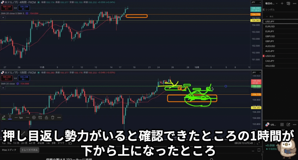 自分は4時間安値かも(安値ではないのだが…)のところの押し目買い否定で入るみたいなイメージに感じた。