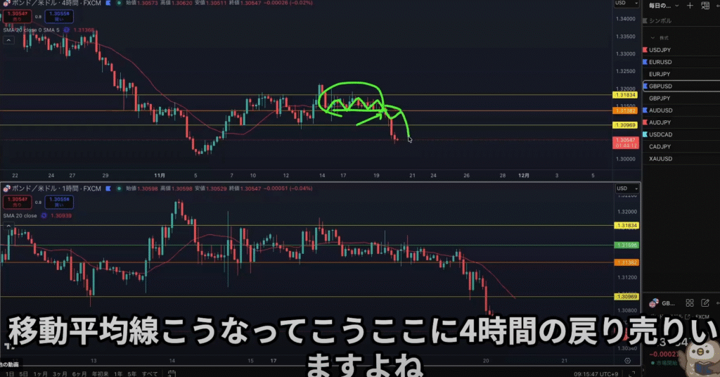 4時間足の戻り売りの1時間足の動きをシナリオでみていく。
