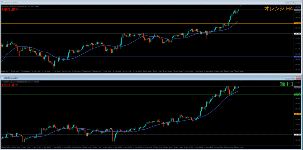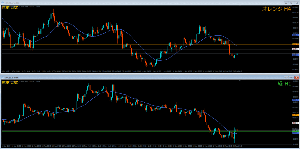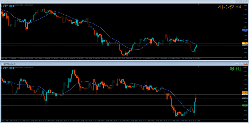 オレンジ色の4時間足サポートラインの下には押し目買い勢力がいる。