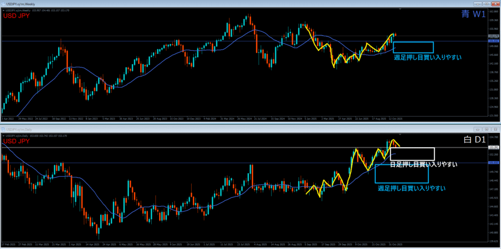 青色の週足サポートラインの下に押し目買い勢力がいる。