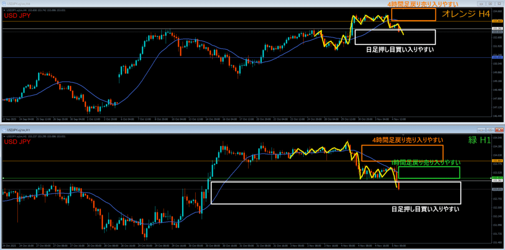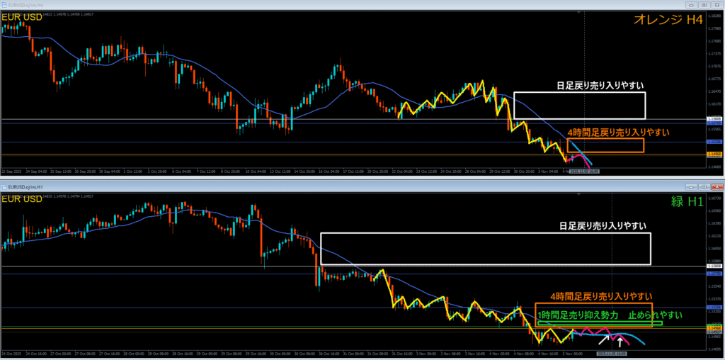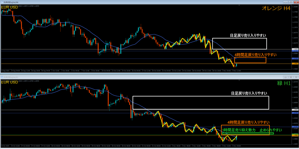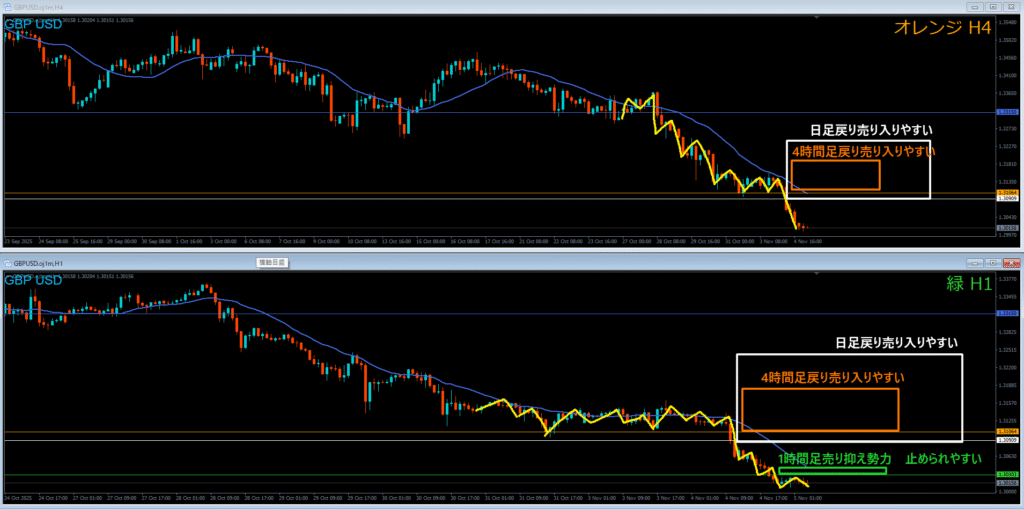 オレンジ色の4時間足レジスタンスラインの上には戻り売り勢力がいる
