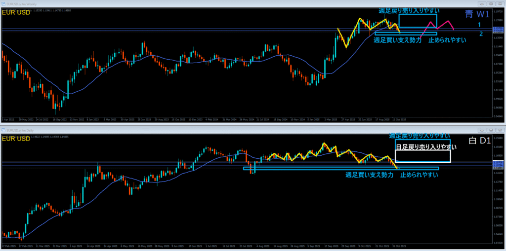 青色の❶週足レジスタンスラインの上には戻り売り勢力がいる。