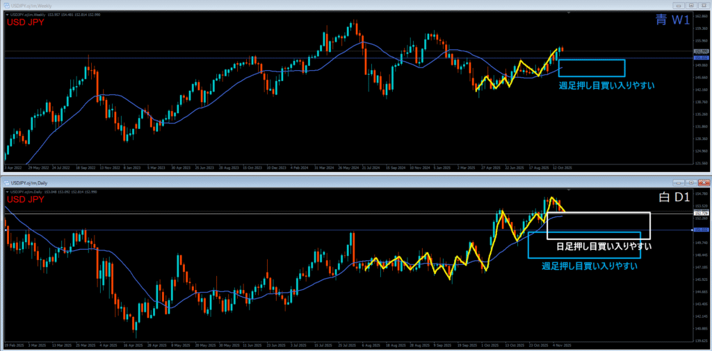 青色の週足サポートラインの下に押し目買い勢力がいる。