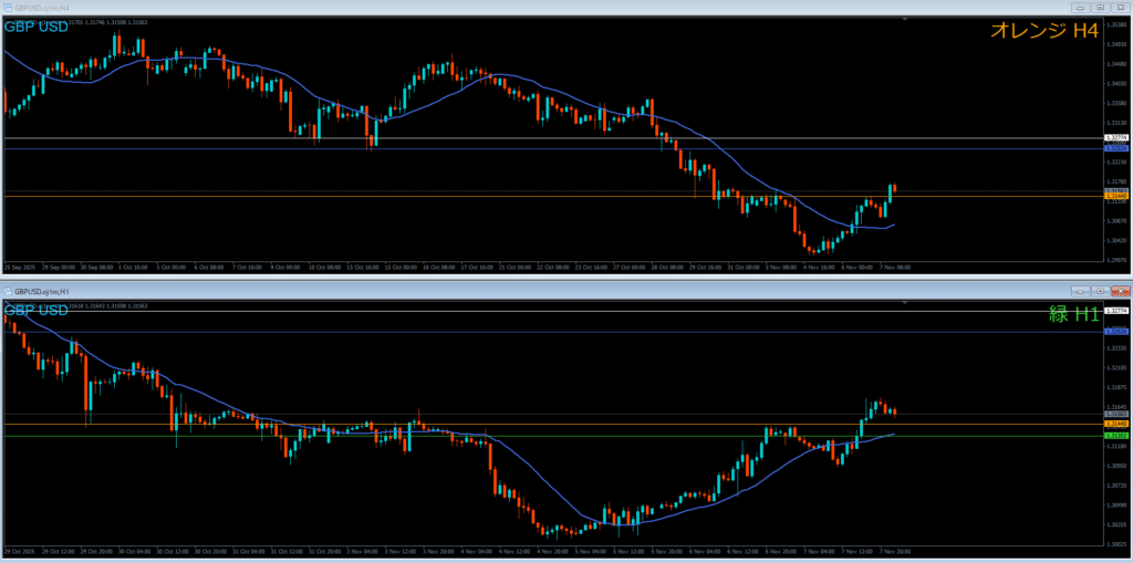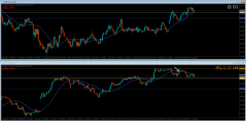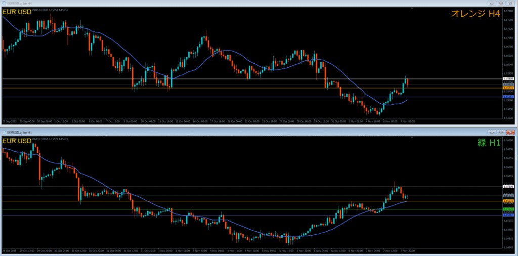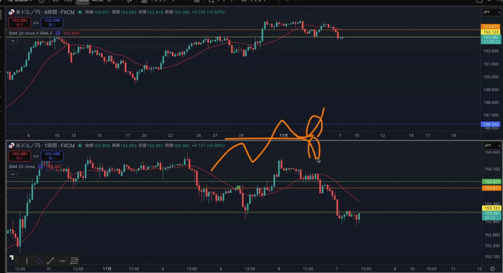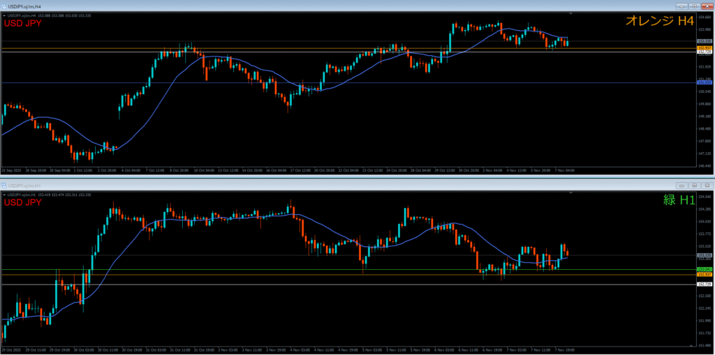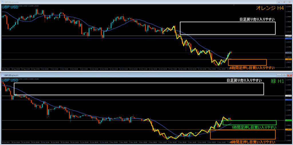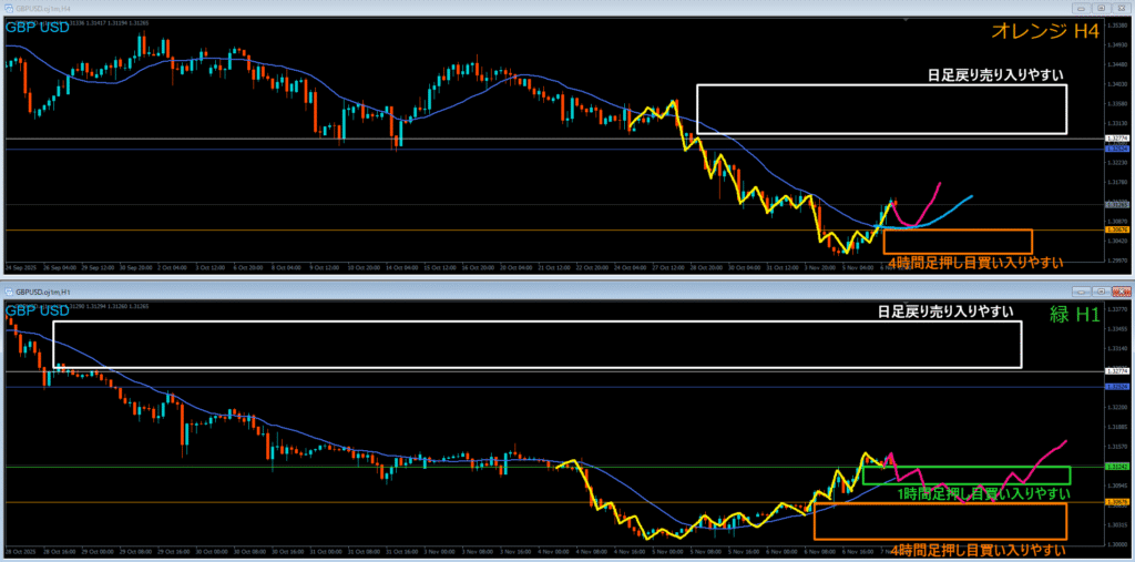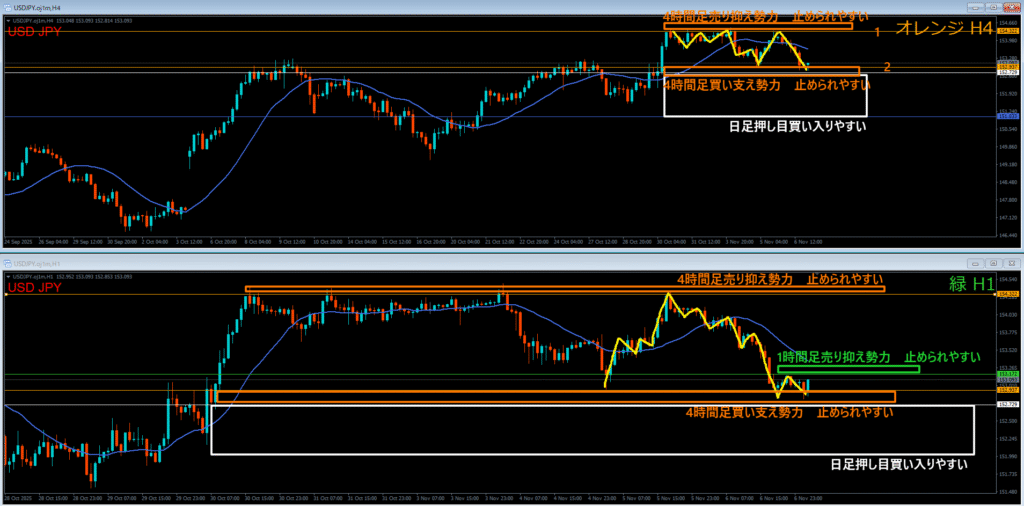 オレンジ色の❷4時間足サポートラインの下には買い支え勢力がいる