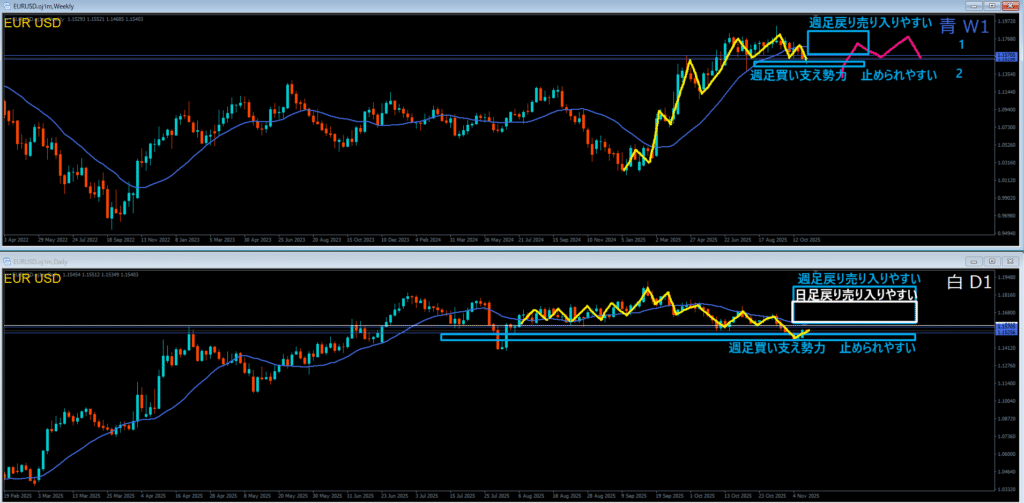 青色の❶週足レジスタンスラインの上には戻り売り勢力がいる。