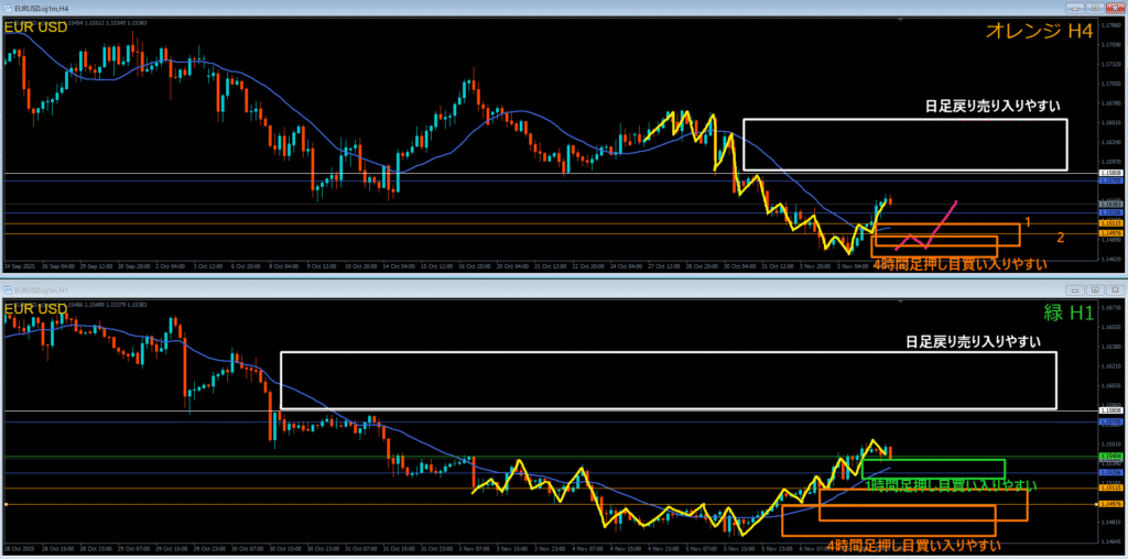 オレンジ色の❶4時間サポートラインの下には押し目買い勢力がいる。