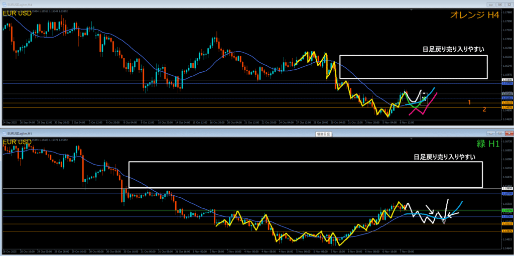オレンジ色の❶4時間足レジスタンスラインの上には売り抑え勢力がいる