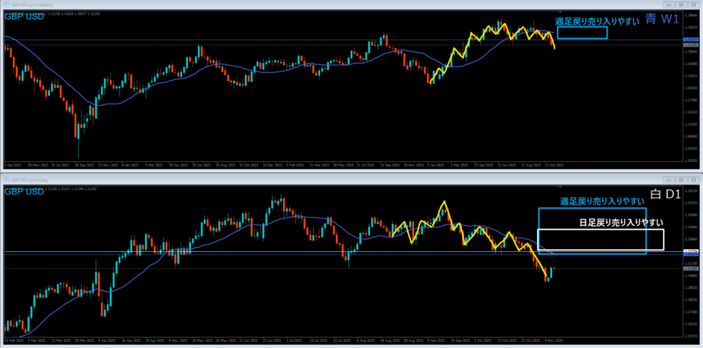 青色の週足レジスタンスラインの上には戻り売り勢力がいる。