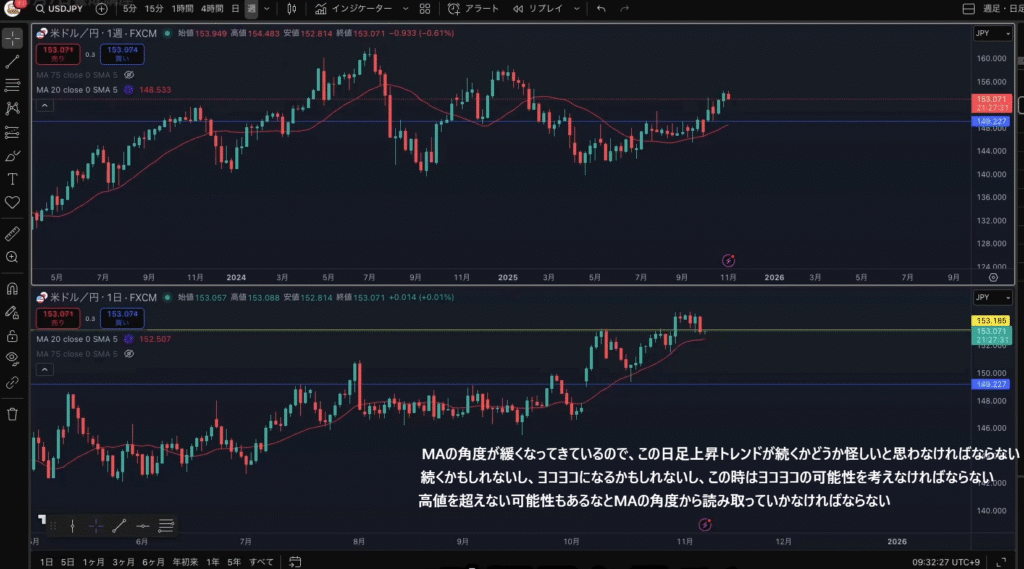 日足MAは上向き→平行。MAは買い支えとして機能しやすい。