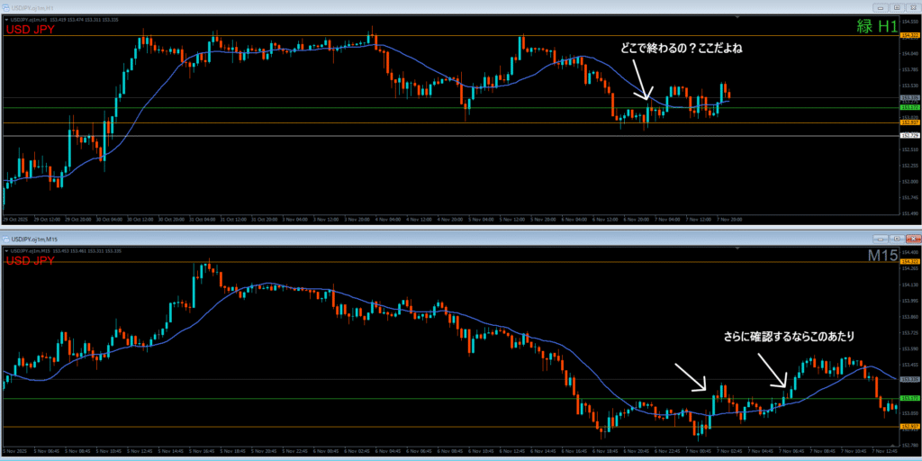 緑色の1時間足サポートラインの下には押し目買い勢力がいる。