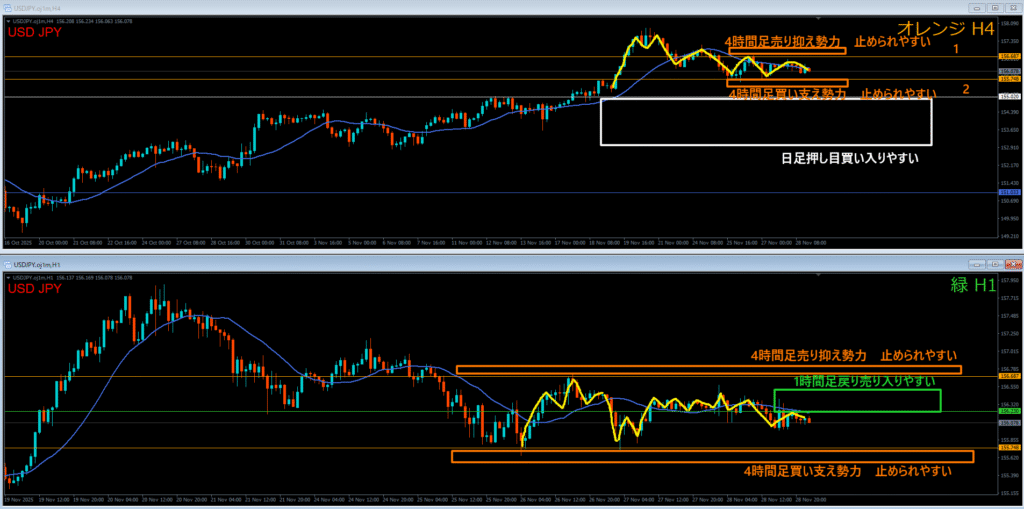 オレンジ色の❷4時間足レジスタンサポートラインの下には買い支え勢力がいる。