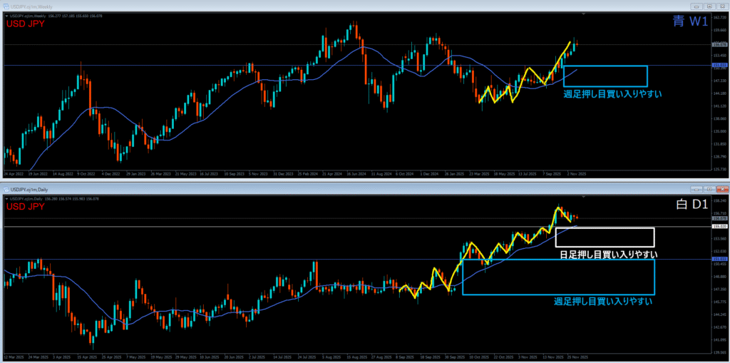 青色の週足サポートラインの下に押し目買い勢力がいる。