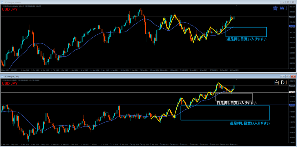 青色の週足サポートラインの下に押し目買い勢力がいる。