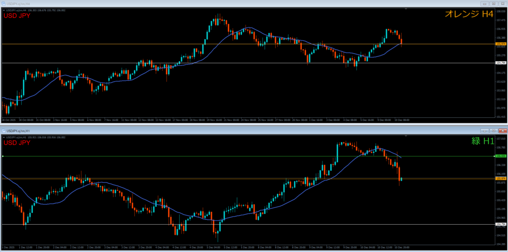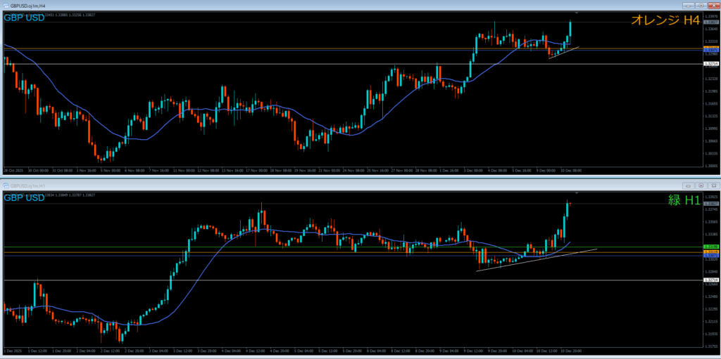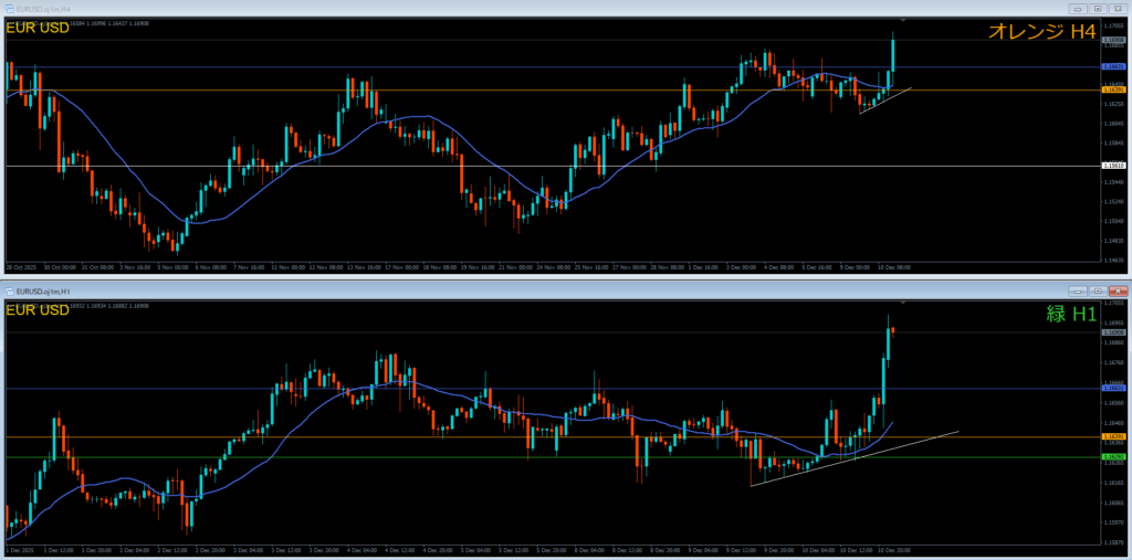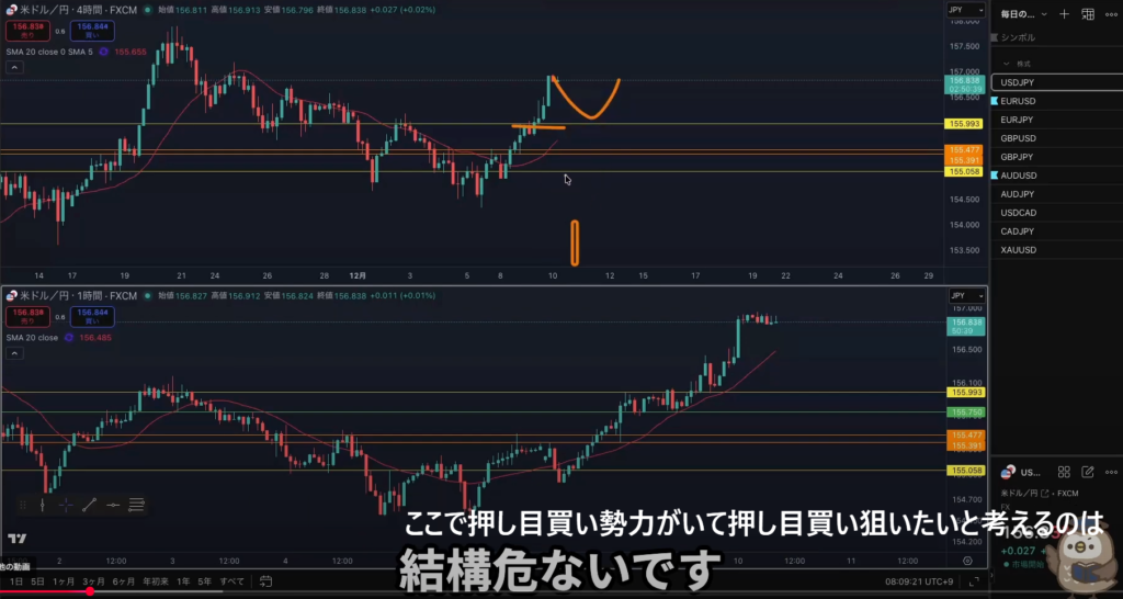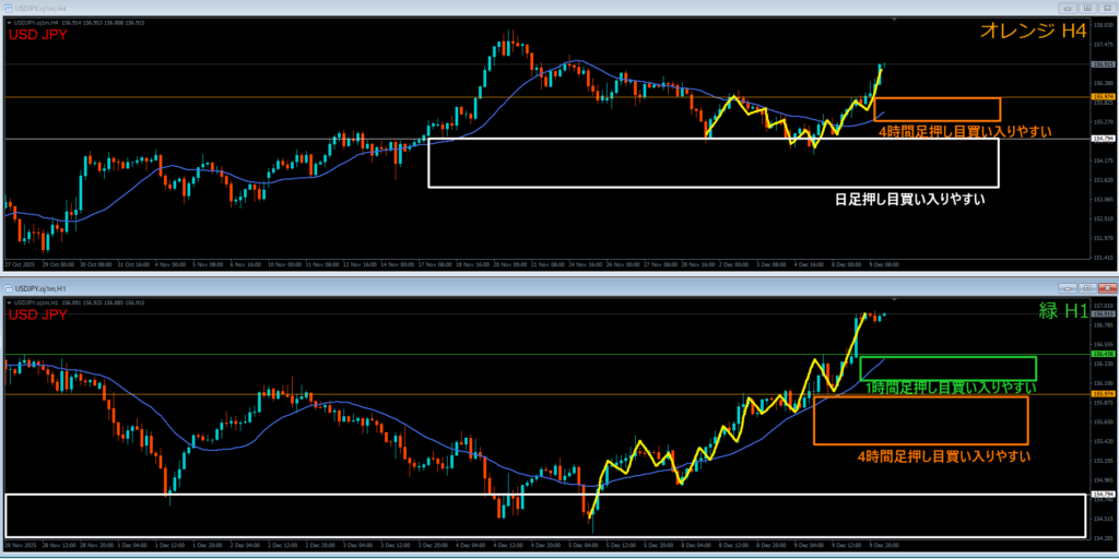 オレンジ色の4時間足サポートラインの下には押し目買い勢力がいる。