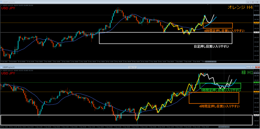 4時間足押し目買いはオレンジ色の4時間足サポートラインが機能していくか見ていく。