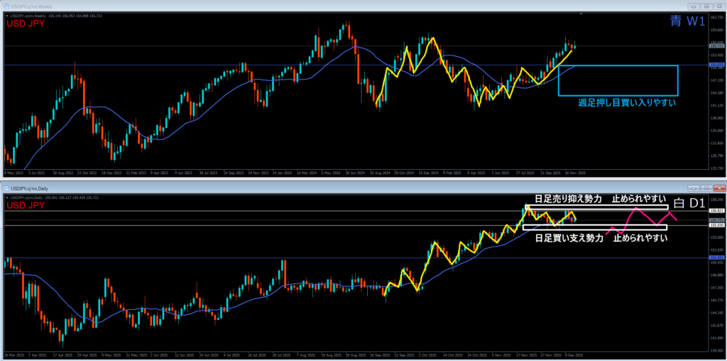 白色の❶日足レジスタンスラインの上には売り抑え勢力がいる。