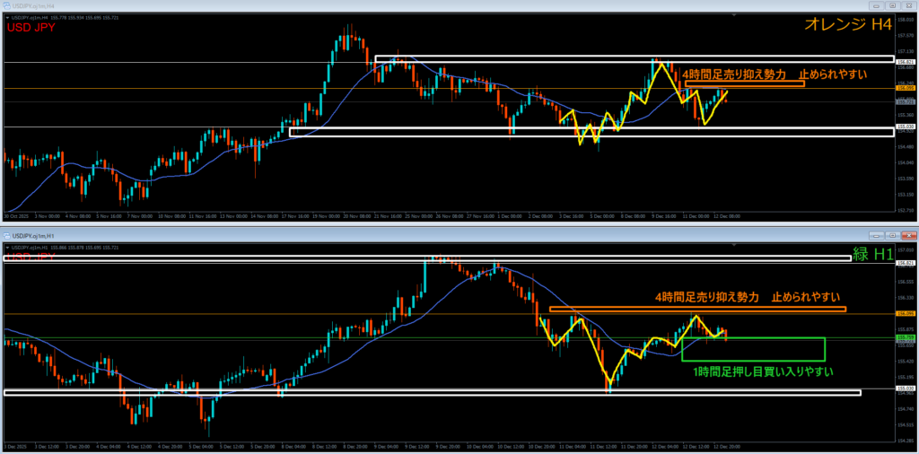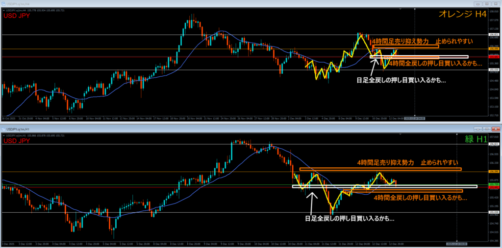 オレンジ色の4時間足レジスタンスラインの上には戻り売り勢力がいる。