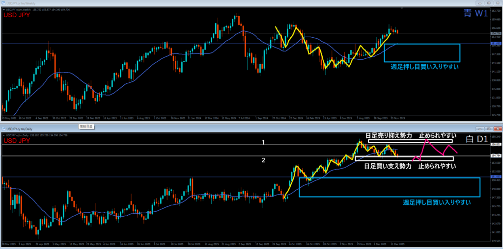 白色の❶日足レジスタンスラインの上には売り抑え勢力がいる。