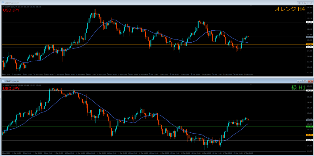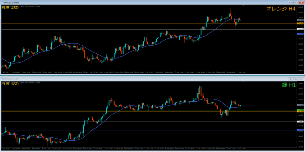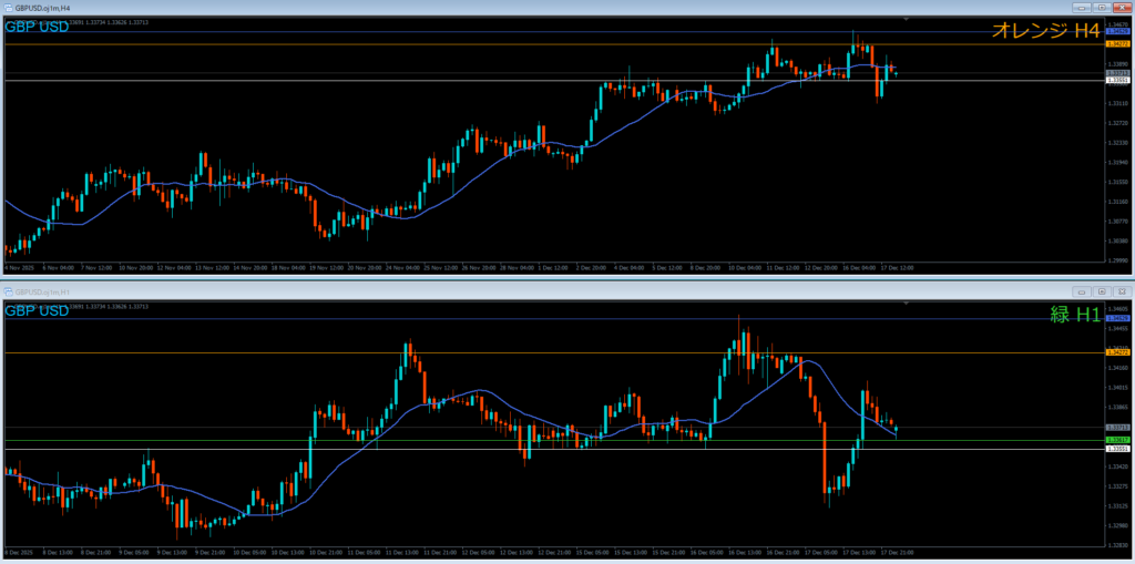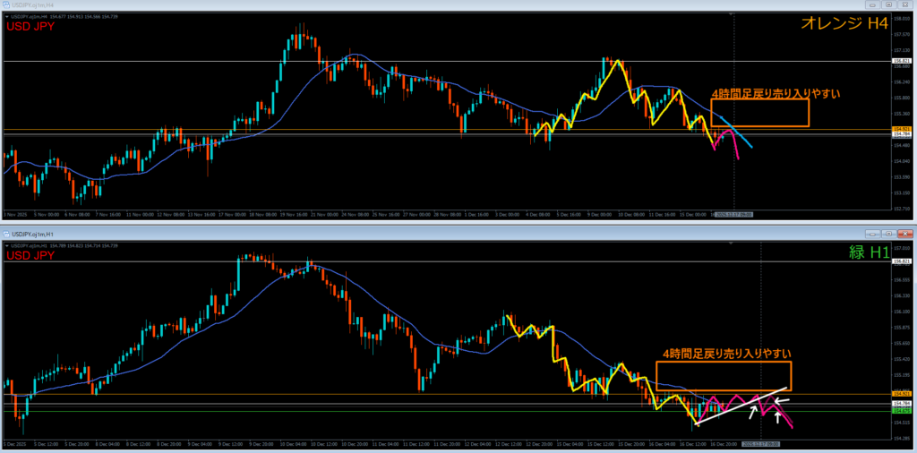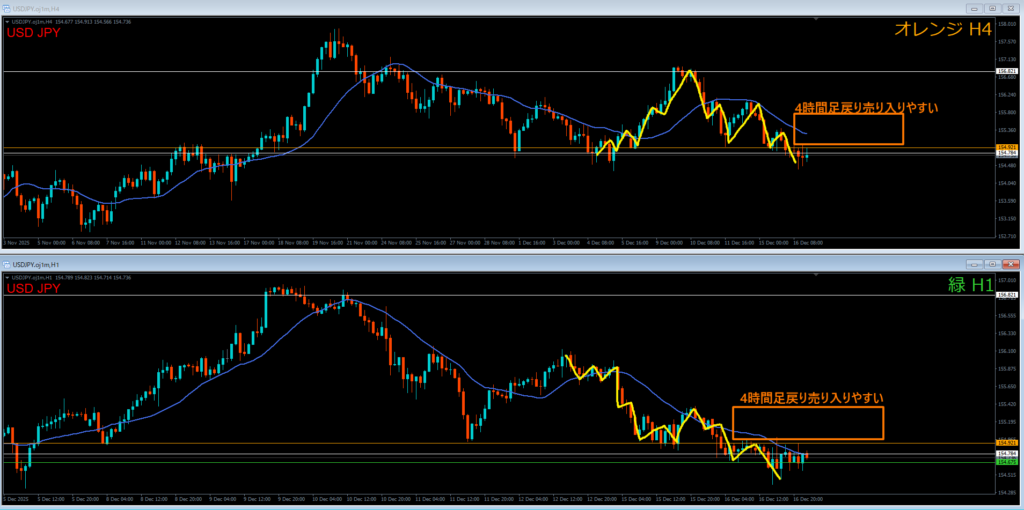 オレンジ色の4時間足レジスタンスラインの上には戻り売り勢力がいる。