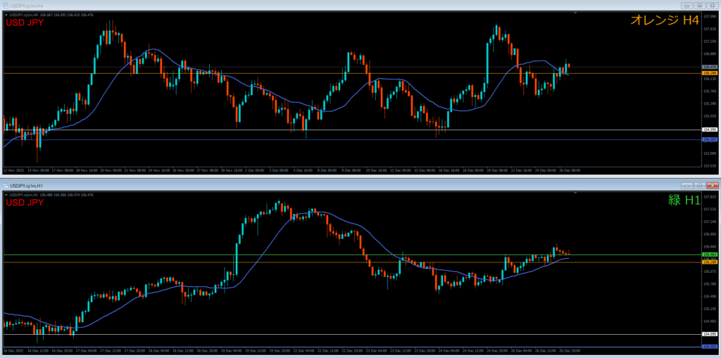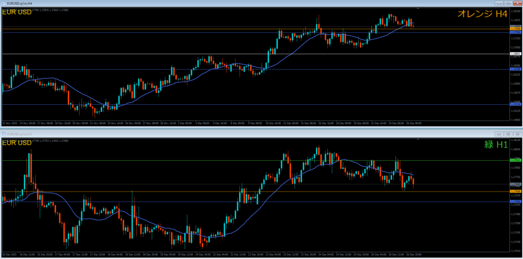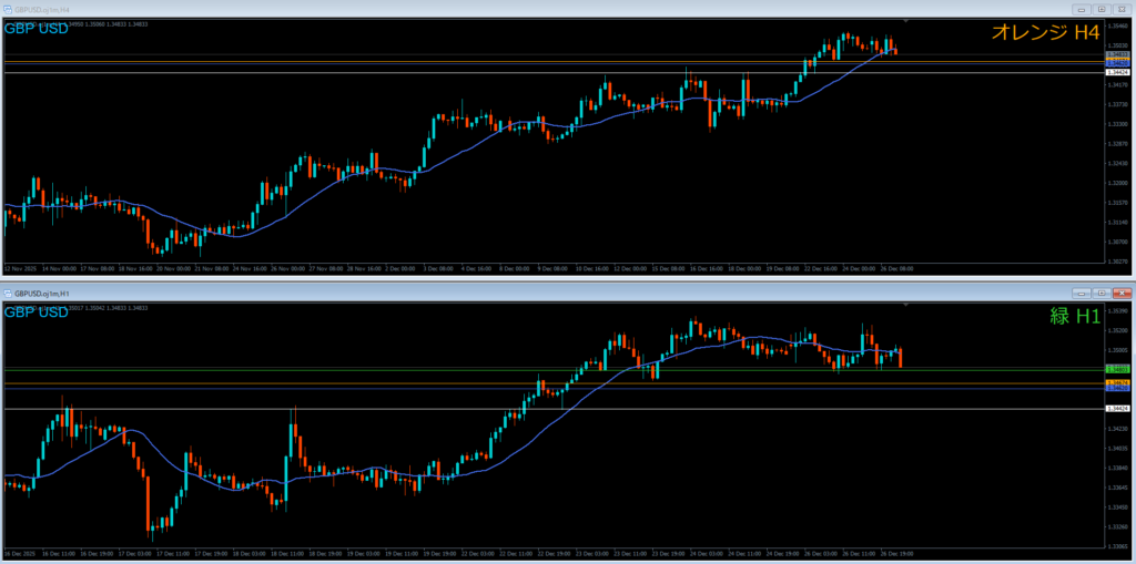 オレンジ色の4時間足レジスタンスラインの上には戻り売り勢力がいる。(補正ダウ前提)