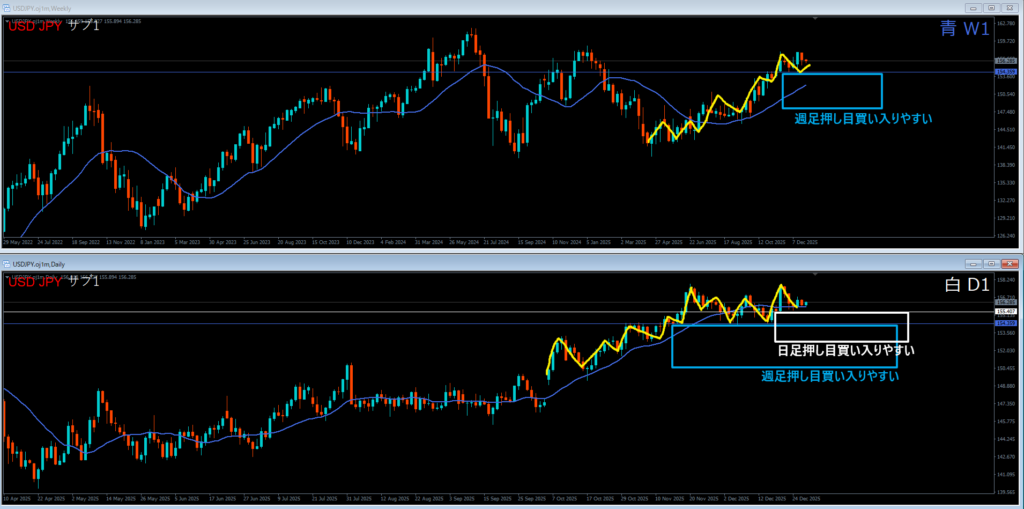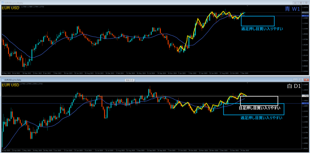 青色の週足サポートラインの下に押し目買い勢力がいる。