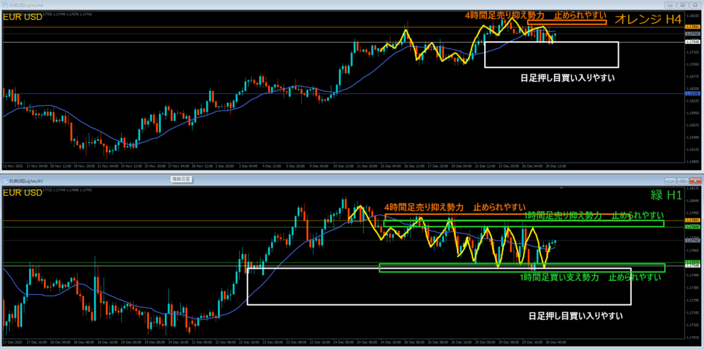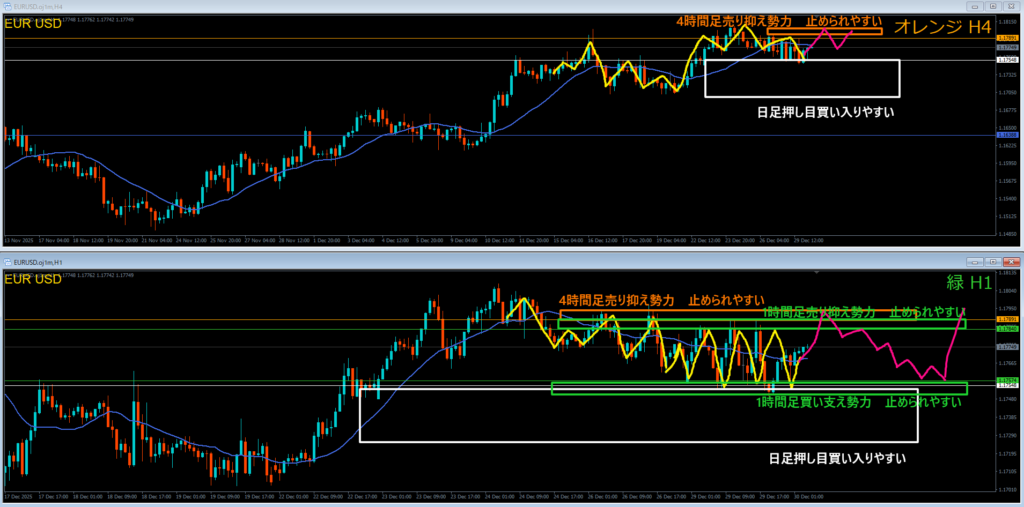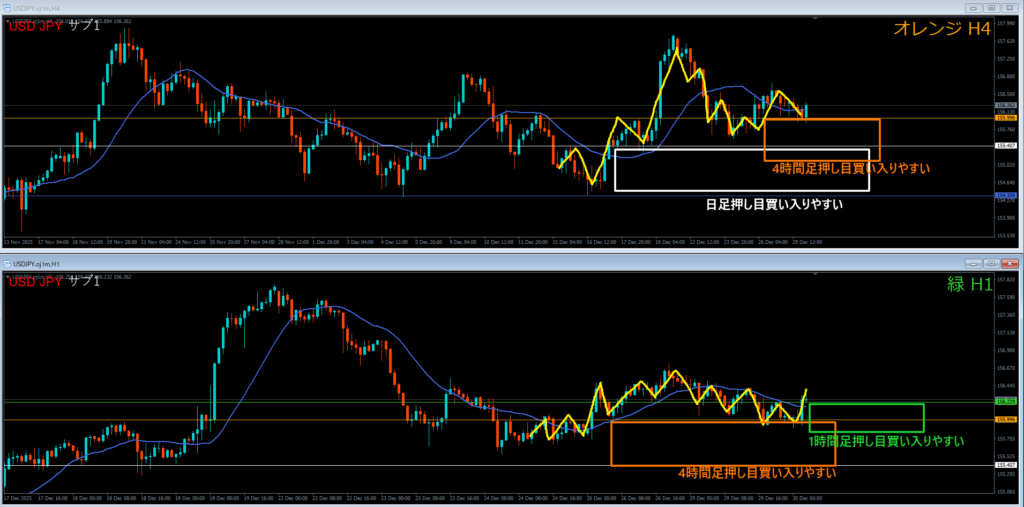 オレンジ色の4時間足サポートラインの下には押し目買い勢力がいる。