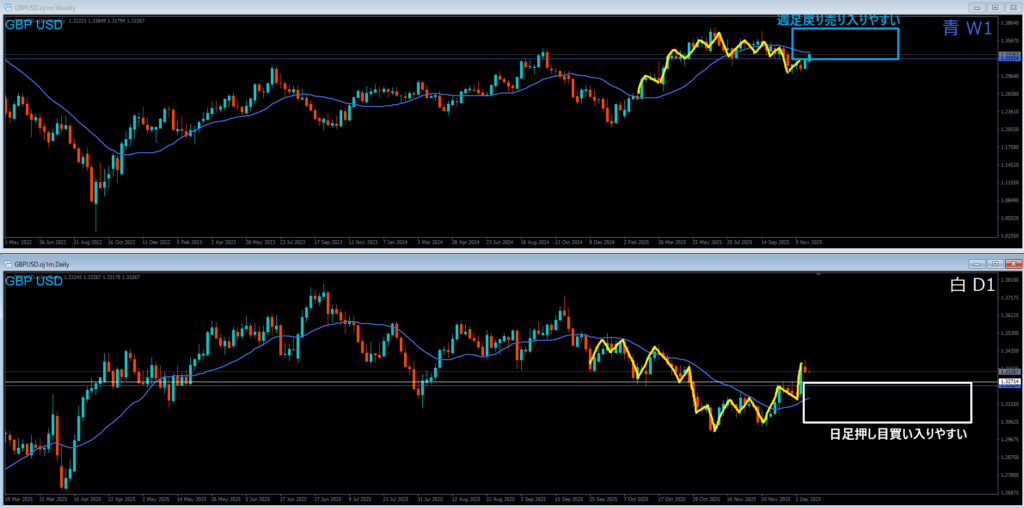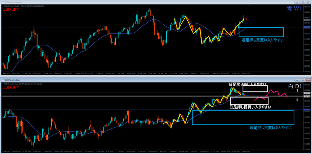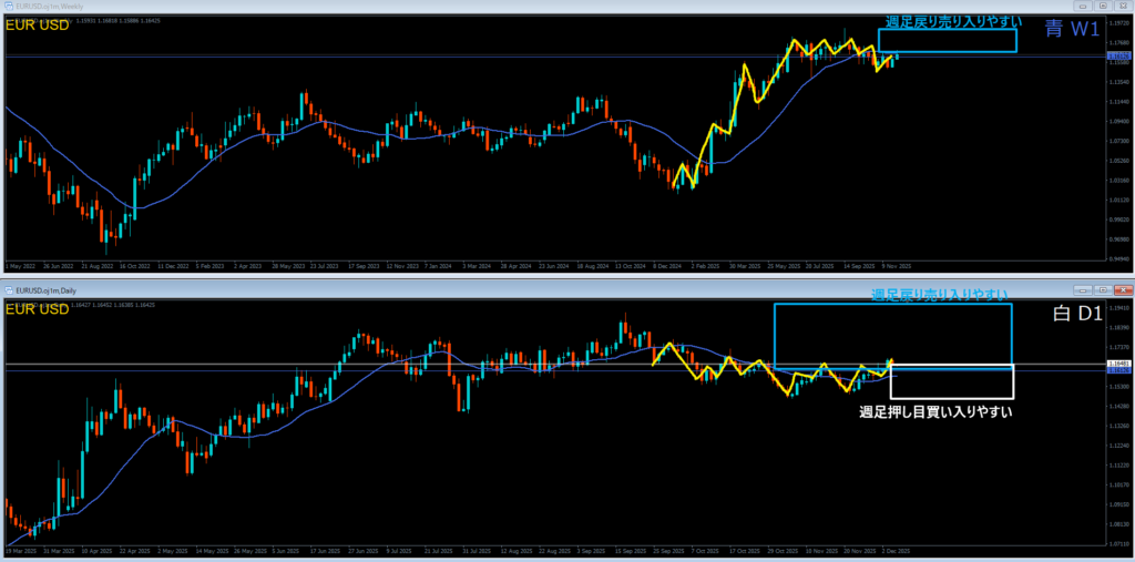 青色の週足レジスタンスラインの上には週足戻り売り勢力がいる。
