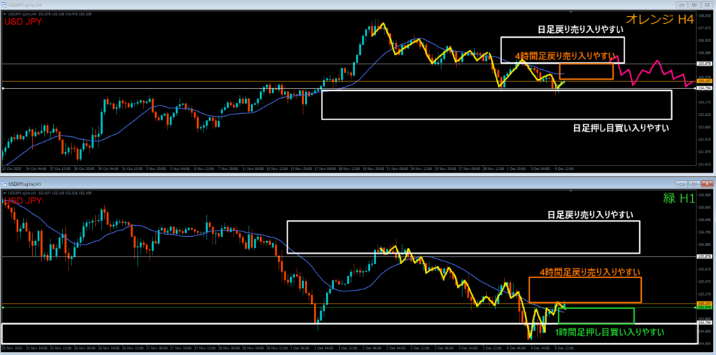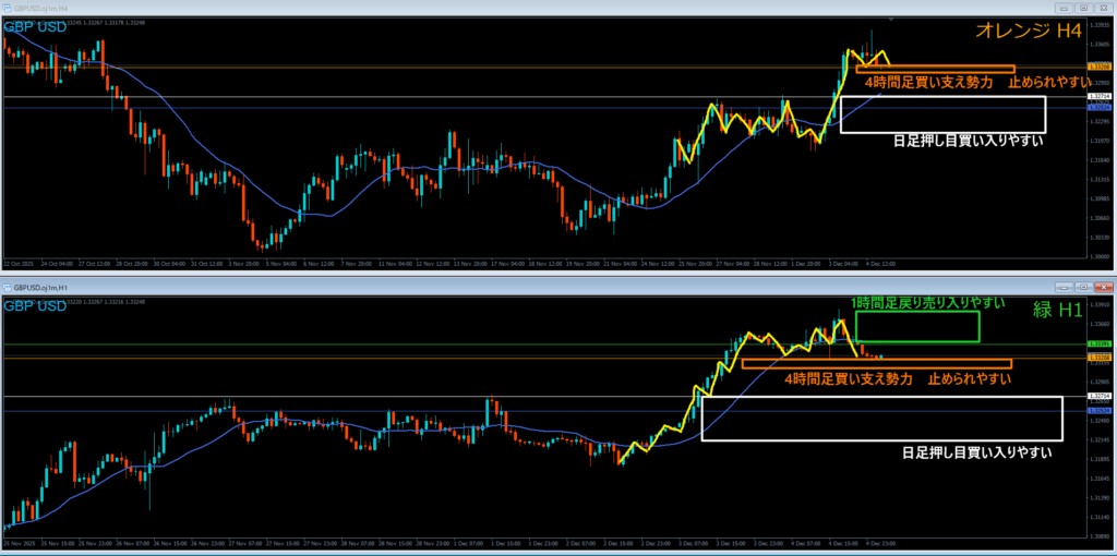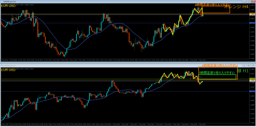 オレンジ色の4時間足レジスタンスラインの上には戻り売り勢力がいる。