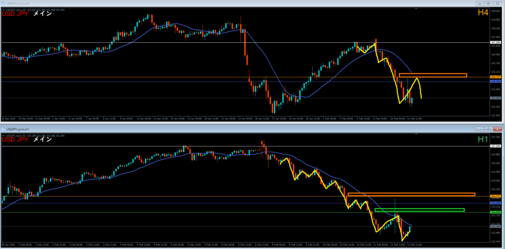 オレンジ色の4時間足レジスタンスラインの上には売り抑え勢力がいる。
