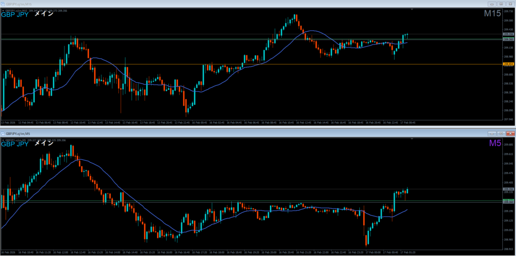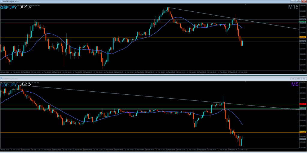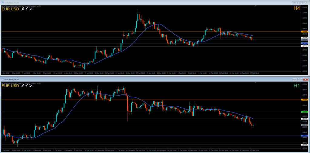 1時間足は安値を割って下落。下落の波の途中。