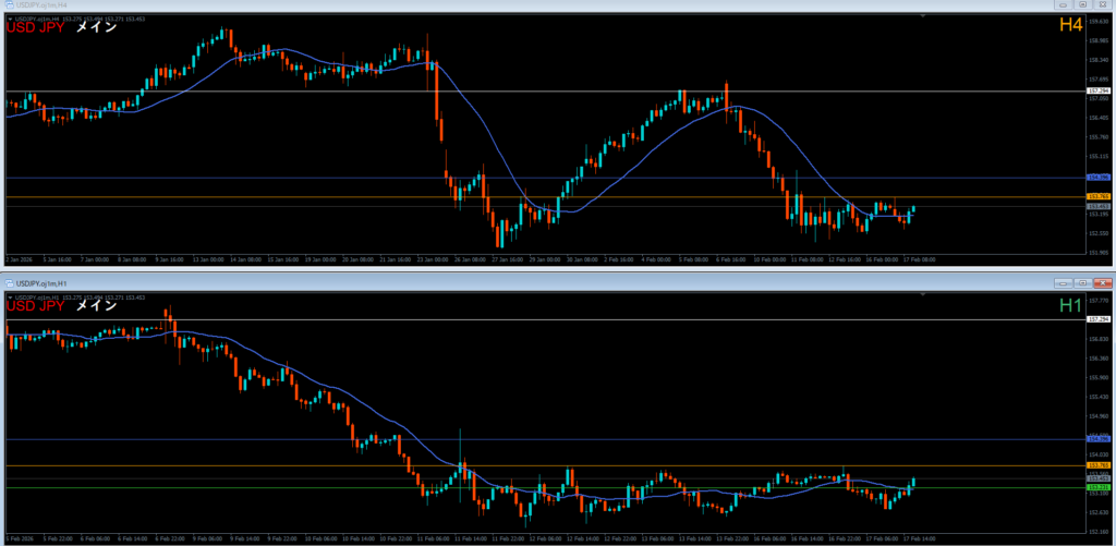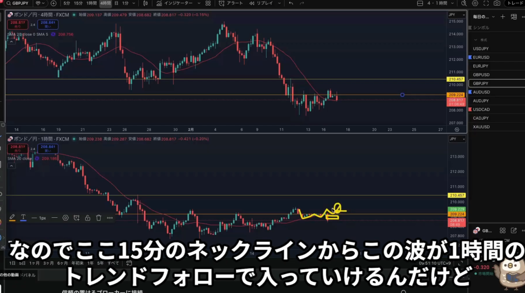 オレンジ色の4時間足レジスタンスラインの上には売り抑え勢力がいる。
