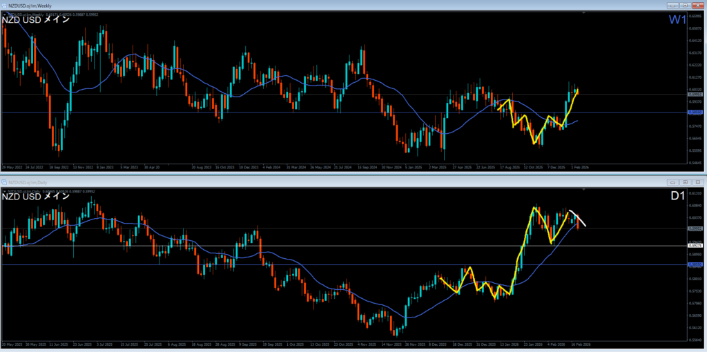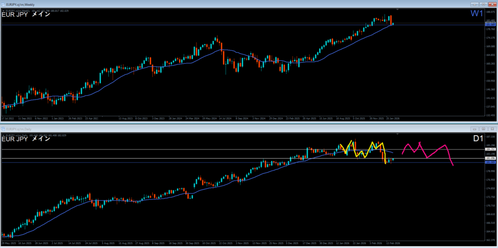 日足上昇波の途中もしくはダブルトップからの調整にはいったか
