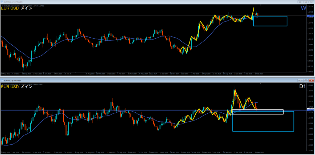 青色の週足レジスタンスラインの上に戻り売り勢力がいる。