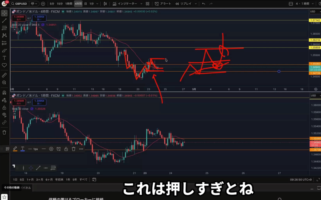 戻り売りはオレンジ色の4時間足レジスタンスラインが機能していくか見ていく。