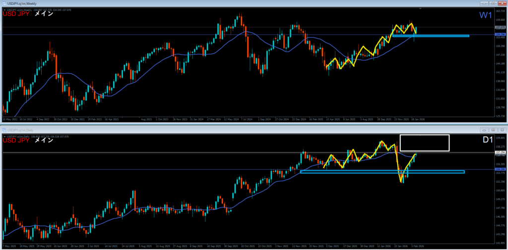 週足は高値を超え上昇。そこから高値を超えず下落買い支え勢力で止められている。先週下に抜けたように感じたが、週末に結局戻してきた。